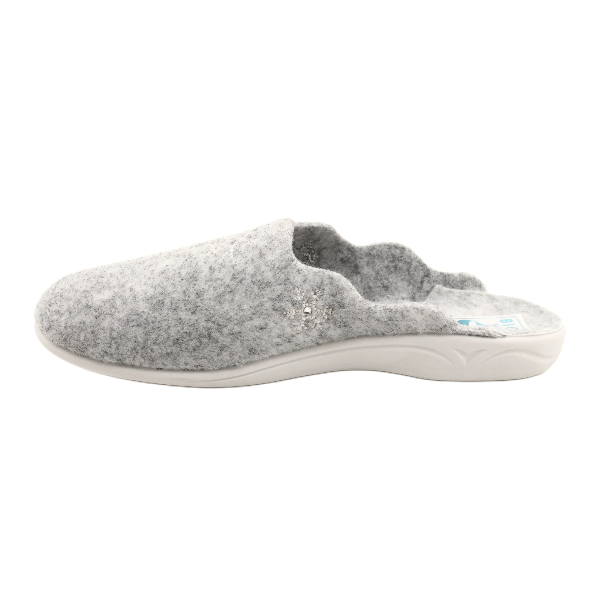 A szintén filcből készült papucs belseje kiváló szigetelést biztosít, a habosított szintetikus anyagból készült PU talp pedig elnyeli a mikroütéseket, így minden lépés könnyű és kényelmes. A papucsok szürke színei bármilyen lakberendezésbe illeszkednek, a dekoratív strasszok pedig eleganciát és stílust kölcsönöznek nekik.