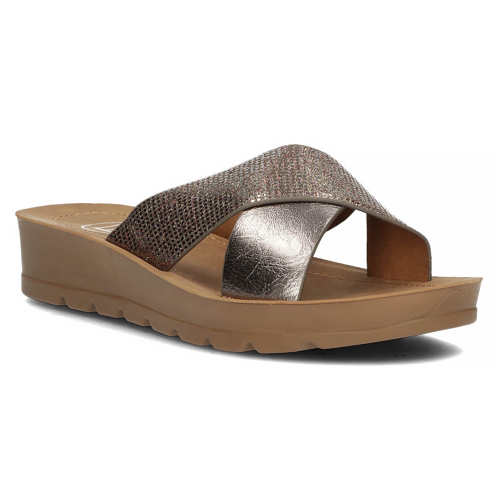 Ezt a modellt a kerek orr és a 4 cm magas ék jellemzi, amely nem csak néhány centiméter magasságot, hanem eleganciát is ad hozzá. A műanyagból készült talp és az ökológiai bőrből készült talpbetét gondoskodik a használat kényelméről, a további fémes tulajdonságok pedig finom stílust kölcsönöznek minden nyári stílusnak.