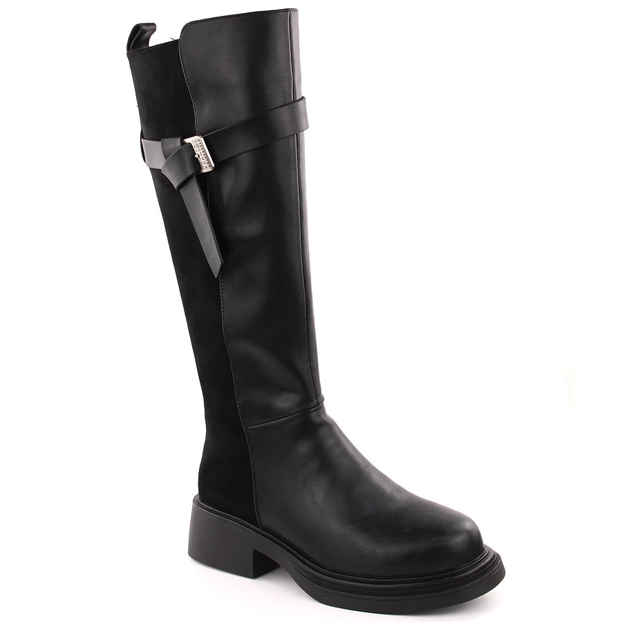Ezt a modellt egy gyakorlati zár jellemzi, amely jelentősen megkönnyíti a felhelyezést, és az 5 cm magasságú lapos sarok egész nap biztosítja a kényelmet. A csizmák térdre jutnak, ami nagyszerű választássá teszi őket napi és különleges alkalmakkor is. A szőrrel bélelt belső terek nemcsak stílusosak, hanem melegebbek is a hűvösebb napokon.