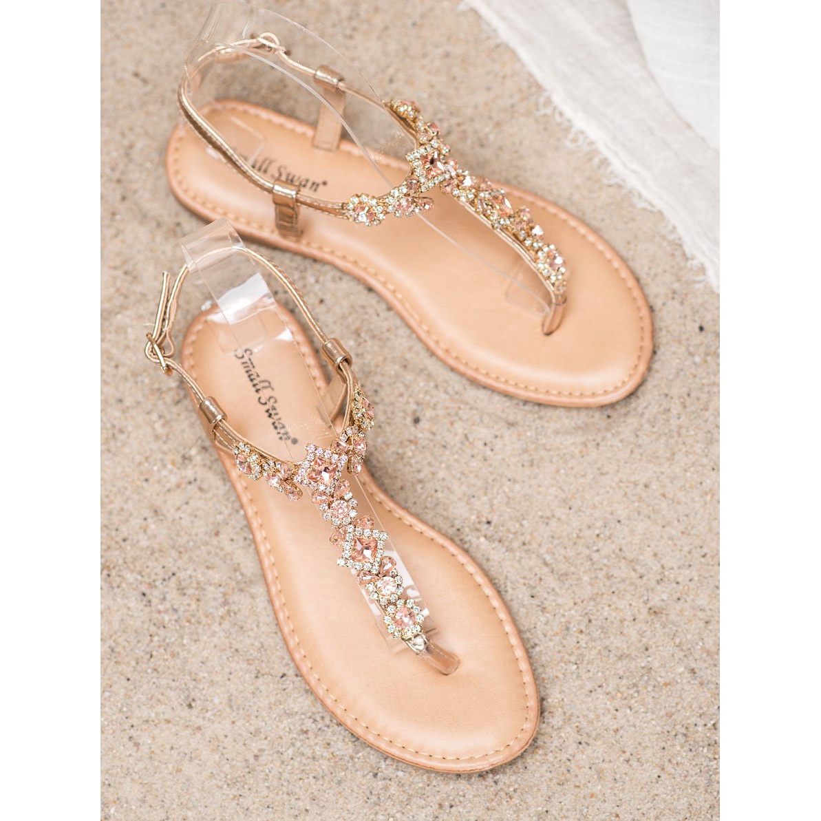 A szandálokat díszítő strasszok felhívják magukra a figyelmet és egyedi karaktert adnak nekik, arany árnyalatuk pedig tökéletesen passzol a legkülönfélébb ruhákhoz – a világos ruháktól a légies szoknyákig. A szandálok kiváló minőségű műbőrből készültek, ami nemcsak a viselési kényelmet, hanem a tartósságot is biztosítja.