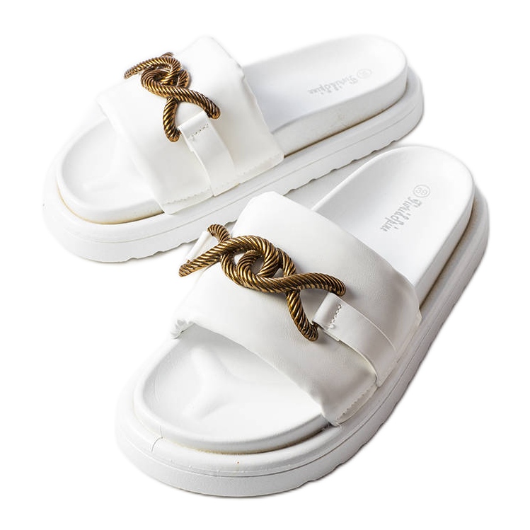 Fehér flip flopok a Frédérique platformon - Elegáns és kényelmes csúszás - a nők papucsokban, finom arany lánccal. Tökéletes a nyárhoz - a mindennapi stílusokhoz, a város körüli sétákhoz vagy ünnepi kirándulásokhoz.