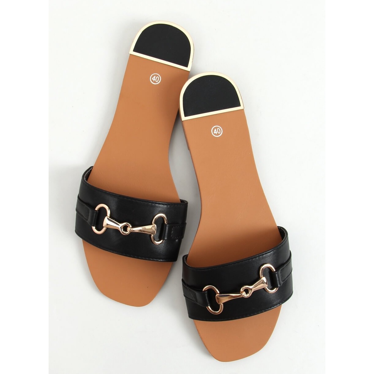 A fekete papucsokat ízléses arany díszítés és a sarkán található plakett jellemzi, amelyek eredetiséget adnak és rendkívül vonzóvá teszik őket. Kiváló minőségű ökológiai bőrből készültek, garantálják a kényelmet és a tartósságot, így ruhatárad pótolhatatlan elemei.