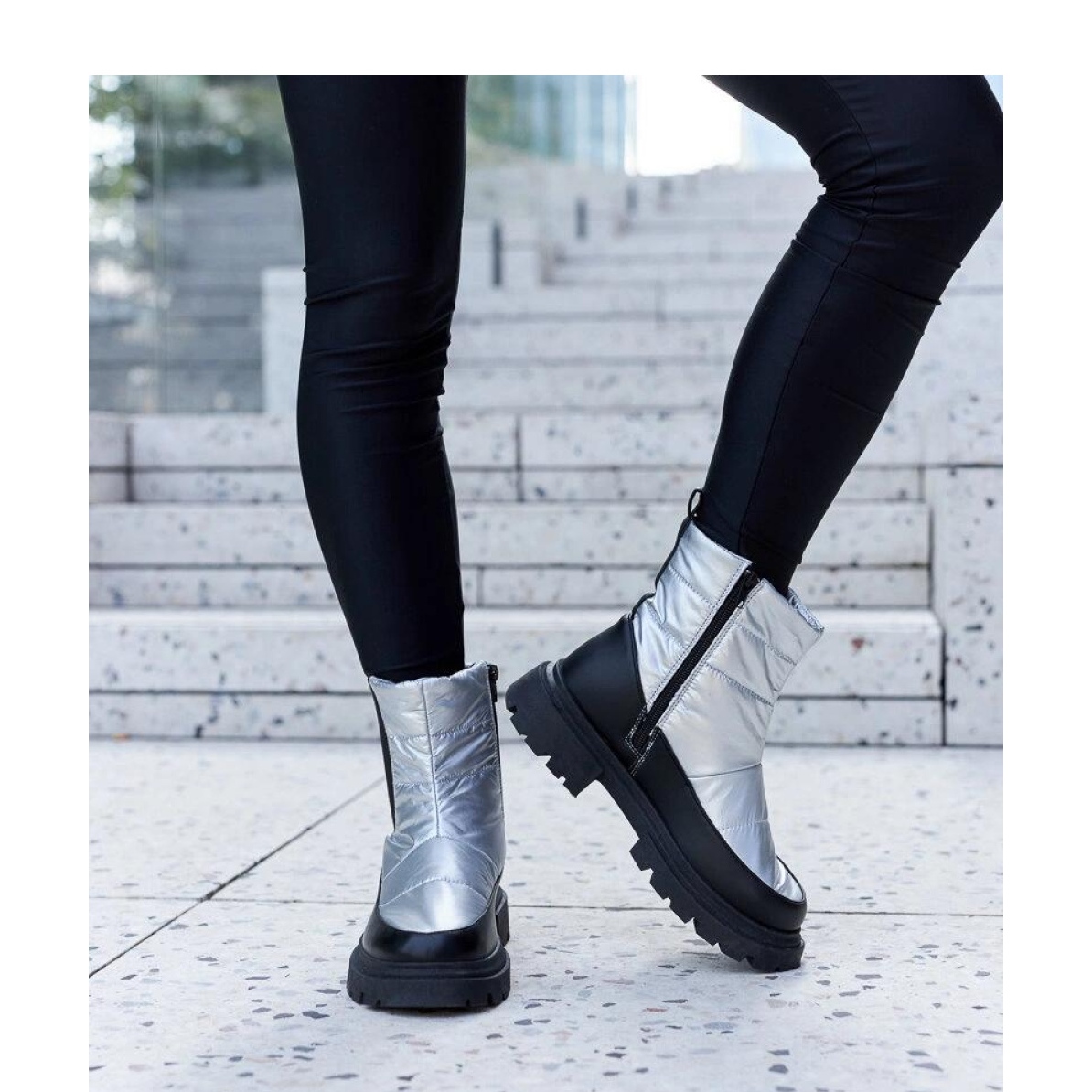 Kiváló minőségű anyagból készült, ezeket a szürke csizmákat divatos, nagy kialakítású, kocka jellemzi. Az oldalon lévő dekoratív retesz nemcsak megkönnyíti a cipő felhelyezését és eltávolítását, hanem lehetővé teszi a szélesség beállítását is, ami jelentősen növeli azok viselésének kényelmét. A fém részletek szokatlan varázst adnak nekik, így minden stilizáció egyedi karaktert szerez.