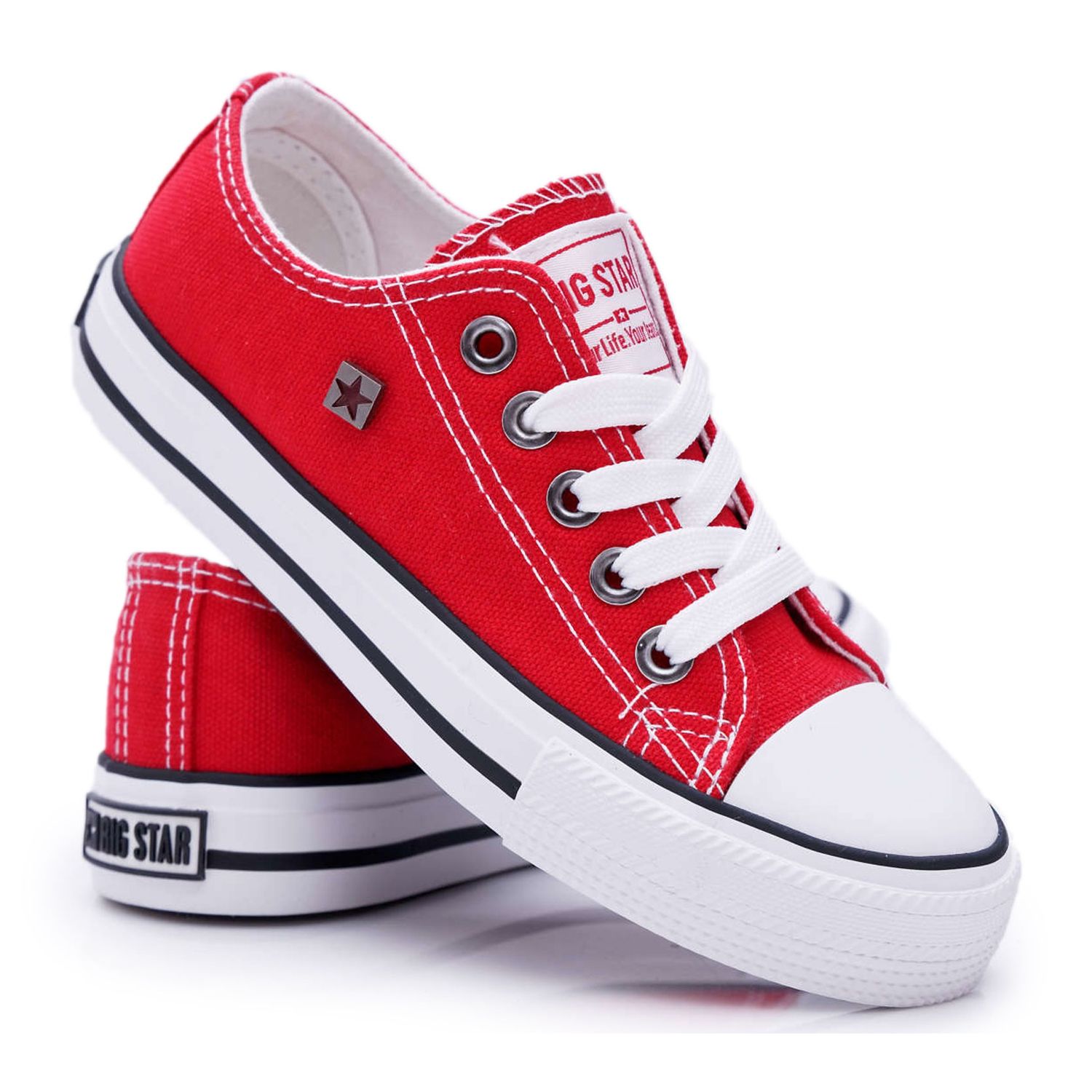 Klasszikus, kényelmes és tele van energiával - a nagy csillagú piros cipők nagyszerű választás tavasszal és nyáron a fiúk és a lányok számára. Teljesen tartós anyagból készül, csipkékkel rögzítve, a márka logóval díszített gumi talppal - a divatos megjelenést és a mindennapi kényelmet kombinálják.