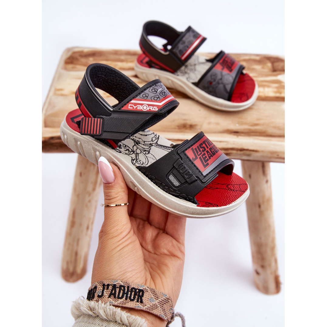 Gyerekek szandálja Grendene Kids JJ385011 - Stílus és kényelem az Igazságügyi Liga kis rajongói számára. A könnyű, rugalmas műanyag kialakítás és a kényelmes tépőzáras rögzítőszer a cipőt könnyen felhelyezi és a gyermek lábához igazítja. Az Igazságügyi Ligából származó karakterisztikus fekete és piros motívum divatos akcentust ad minden nyári stilizálásról.