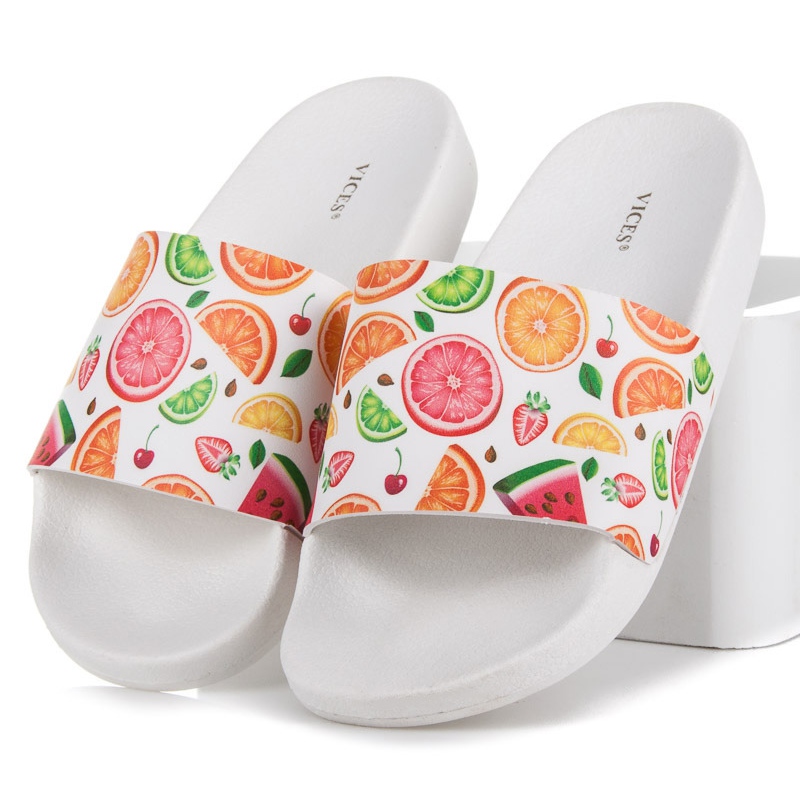 Fedezze fel a frissítő stílust a fehér gyümölcsös mintájú Vices papucsokkal! Ha szeretnél egy kis frissességet és energiát adni nyári megjelenésedhez, ezek a papucsok a tökéletes megoldást. Ökológiai bőrből készült, kiváló minőség és viselési kényelem jellemzi őket, így kiváló választás a mindennapi használatra.