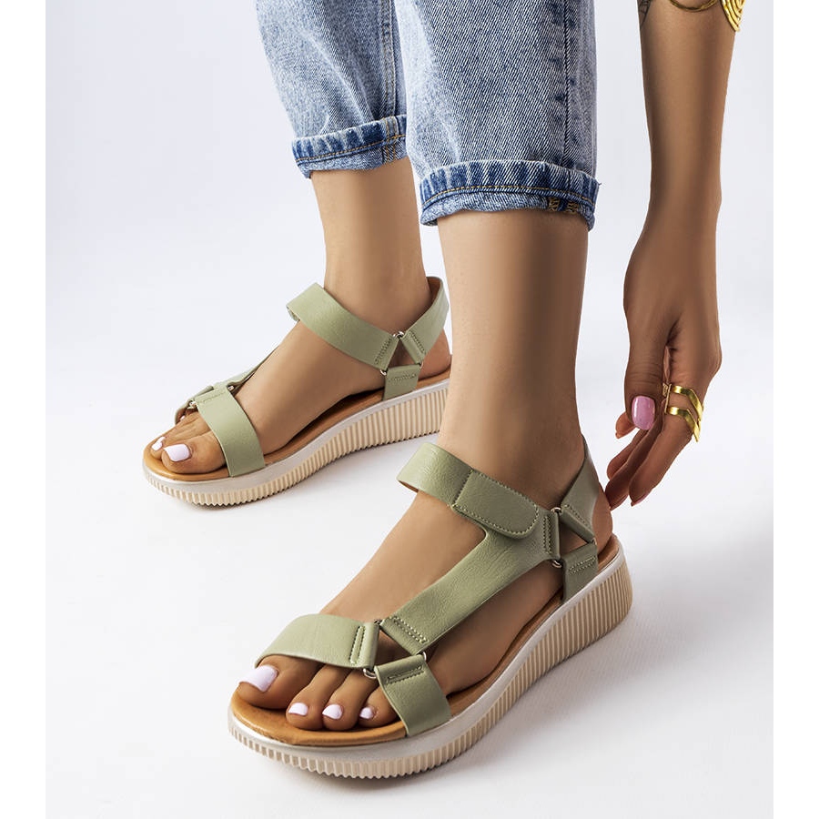 A zöld gém szandál a nyári stílus kvintesszenciája. Sportos szabású és bézs színű talpuk tökéletesen passzol a különféle nyári ruhákhoz. Az ökológiai bőr használatának köszönhetően kívül és belül is a szandálok környezetbarátak, miközben kényelmes viseletet biztosítanak.