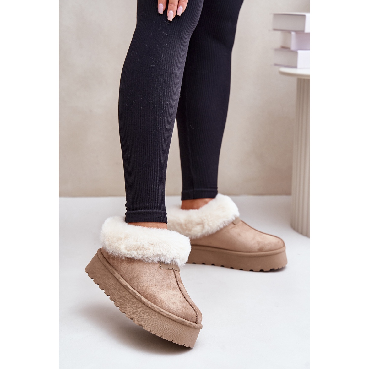 Részletek: Hócsizma alacsony felsőrésszel, szőrmével a platformon Eco Suede Dark Beige Neathoria bézs