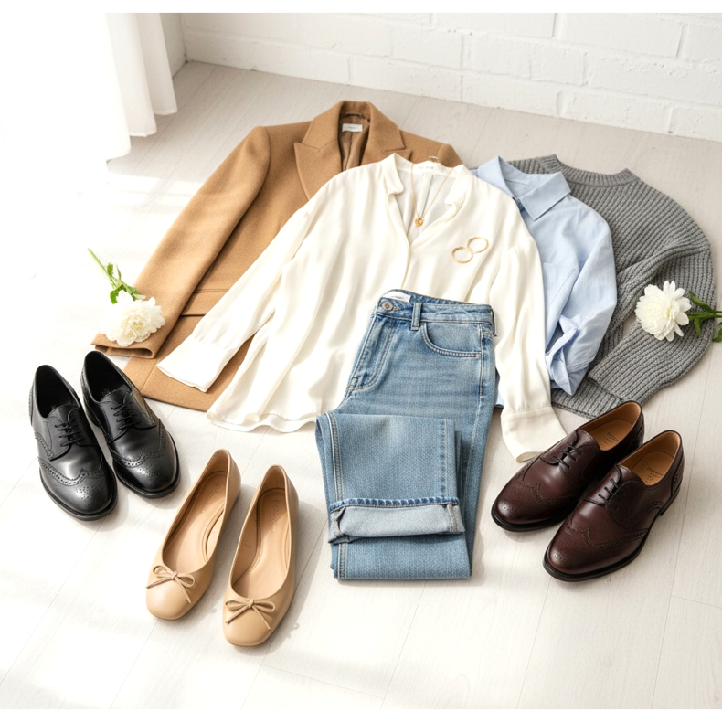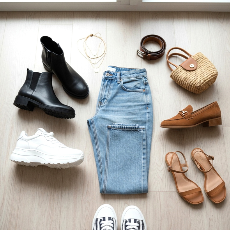 Ha szeretnéd anyukád farmerének elegánsabb karaktert adni, válassz balettcipőt vagy alacsony cipőt. Ez a kombináció mindennapi használatra és formálisabb helyzetekre egyaránt alkalmas.