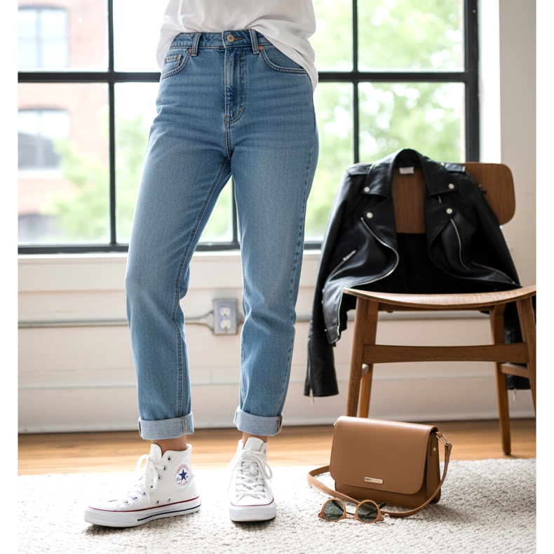 Formázási trükk: tekerje fel a mom farmer szárát körülbelül 2-4 cm-rel, szabaddá téve a bokát a cipő felett. Ez az egyszerű mozdulat azonnal optikailag meghosszabbítja a lábakat, és az egész stílusnak könnyed, közömbös karaktert kölcsönöz. Próbáld ki ezt a kombinációt farmerba bújtatott pólóval és bőrdzsekivel – tökéletes megjelenés egy tavaszi városi sétához.