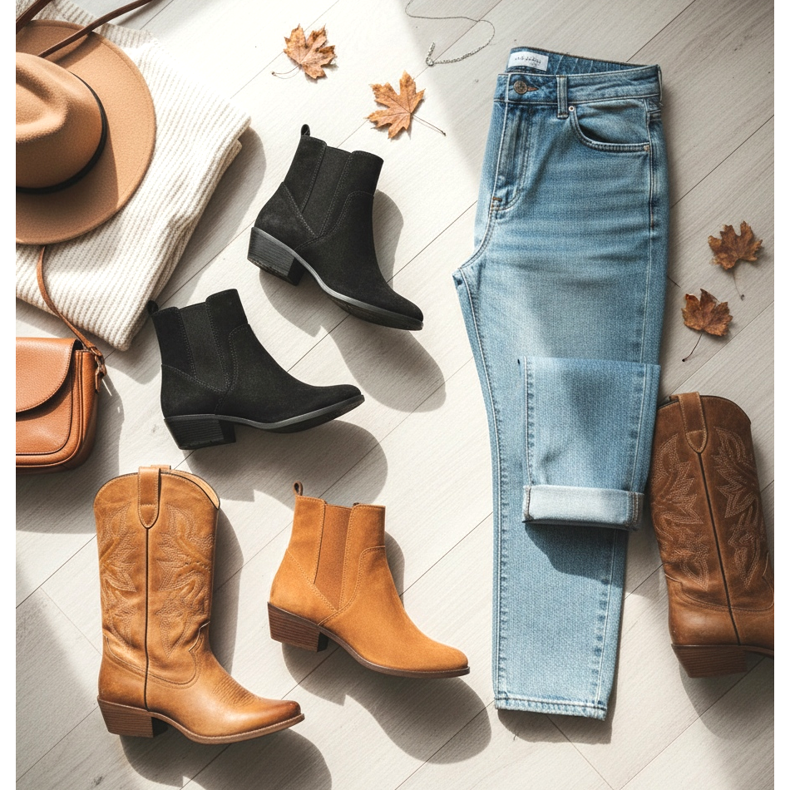 A 2026-ban újra divatba kerülő Cowboy csizmák fantasztikusan mutatnak a mom farmerrel. Tekerje fel a lábakat a vádli közepéig, szabaddá téve a cowboy csizma felső részét. Ez a kombináció retró jellegű, ugyanakkor stílusosan nagyon aktuális.