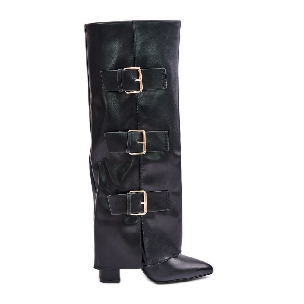 Részletek: Hőszigetelt női magassarkú csizma felhajtott felsőrésszel és csatokkal, Black Pyregonia fekete