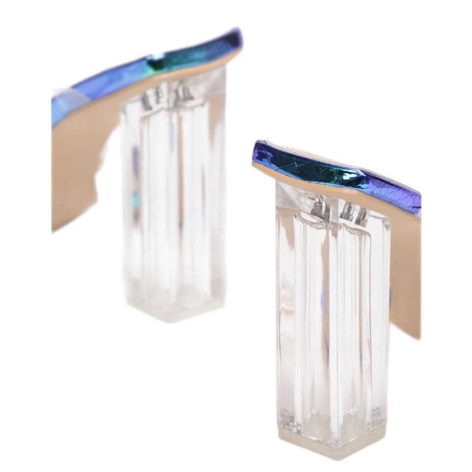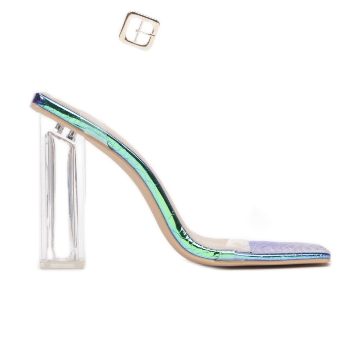 Művészi csattal rögzítve biztonságos illeszkedést és stabilitást biztosítanak, így tökéletes választás különféle alkalmakra. A 10,5 cm magas geometrikus oszlop eleganciát ad, miközben optikailag meghosszabbítja a lábakat. A kitett, szögletes orr kiemeli a cipő modern jellegét.
