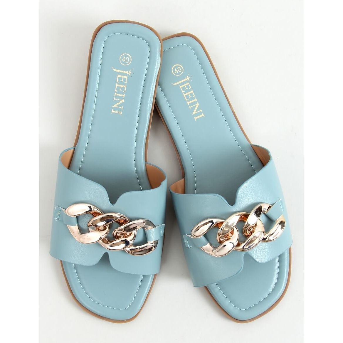 A kiváló minőségű ökológiai bőrből készült papucsok egyesítik a kényelmet az eleganciával. A kék árnyalatú, arany láncdíszekkel díszített színek tökéletesen illeszkednek a nyári ruhákhoz és a hétköznapi stílusokhoz. A bézs színű talp finomságot ad, a lapos sarok pedig kényelmes viseletet biztosít egész nap.