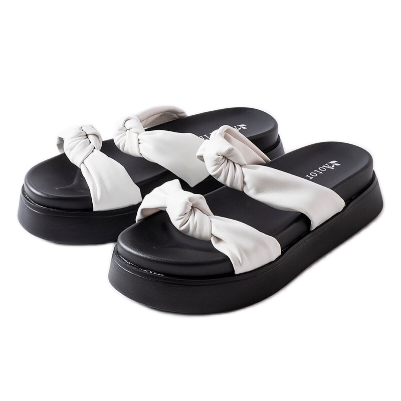 Fehér flip -flopok a Katelin platformon - napi könnyű, nyári ajánlat. A minimalista, univerzális fehér színű, fekete talpú vágás, rövidnadrágban és tágas ruhákban is működni fog. A 4,5 cm -es magas platform centimétereket és stabilitást ad, megőrizve a kényelmet a teljes napos viselés során.