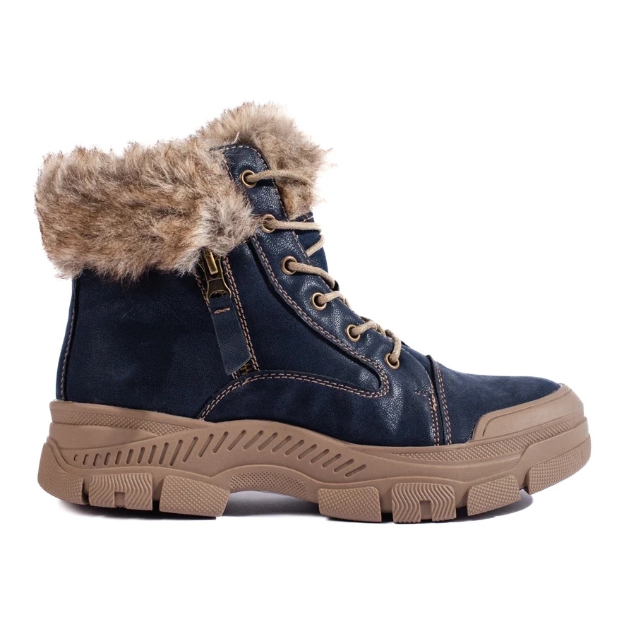Kék női csapdák szőrme - Meleg, kényelmes és elegáns cipő hűvösebb napokra. Tökéletes az őszi és téli mindennapi, alkalmi és sport stílushoz. Az ökológiai bőr, a lágy báránybőr és a szilárd talp kombinációja biztosítja a kényelmet, a szigetelést és a jó tapadást.