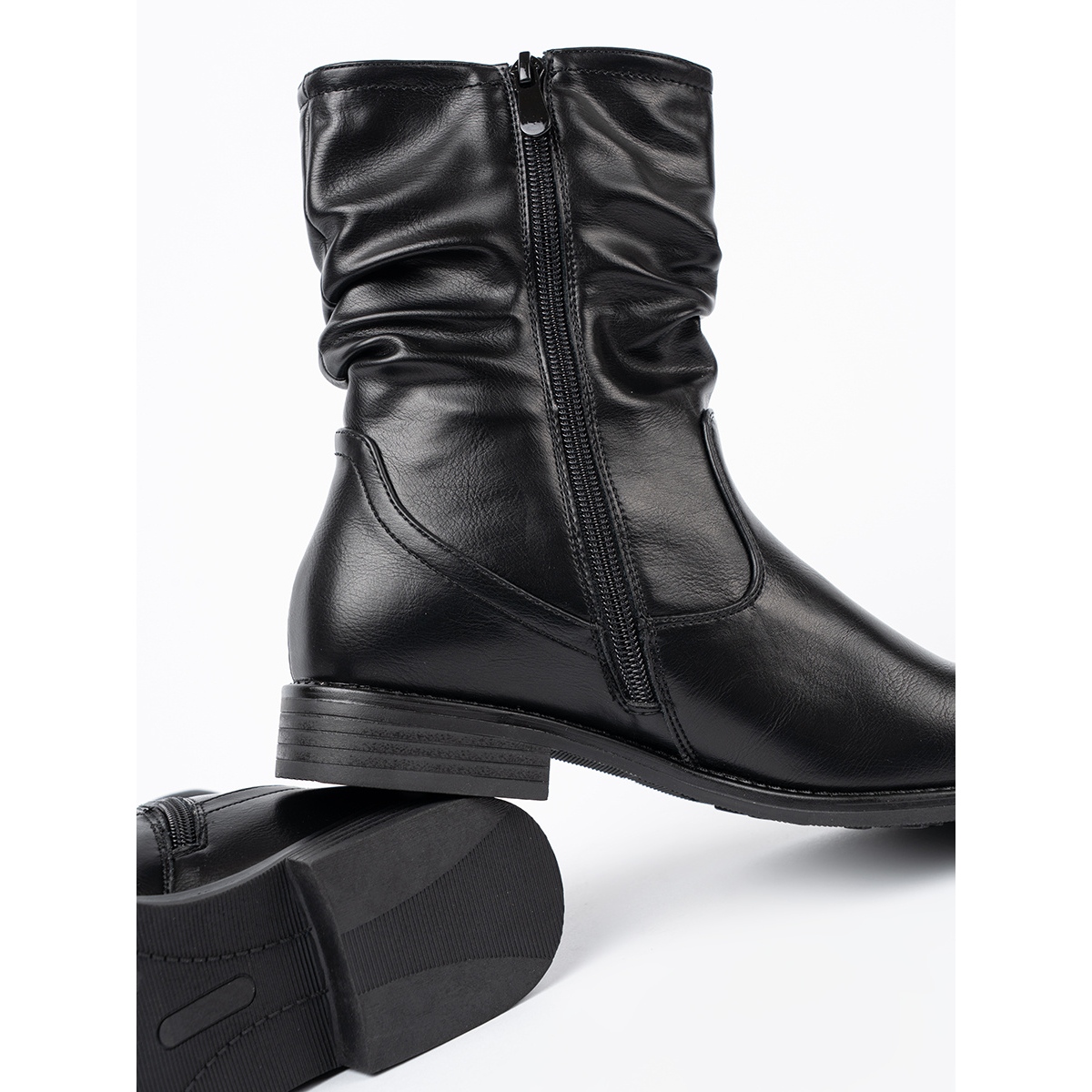 A csizmák sima műanyag talppal rendelkeznek, amely garantálja a jó tapadást, és a sarok magassága 3 cm lehetővé teszi, hogy szabadon mozoghasson mind a nap folyamán, mind az esti kirándulások során. A kerek lábujj és a felső 28 cm szélessége nőstény varázst ad a cipőhöz, és univerzális fekete színük sokféle stílushoz tökéletes.