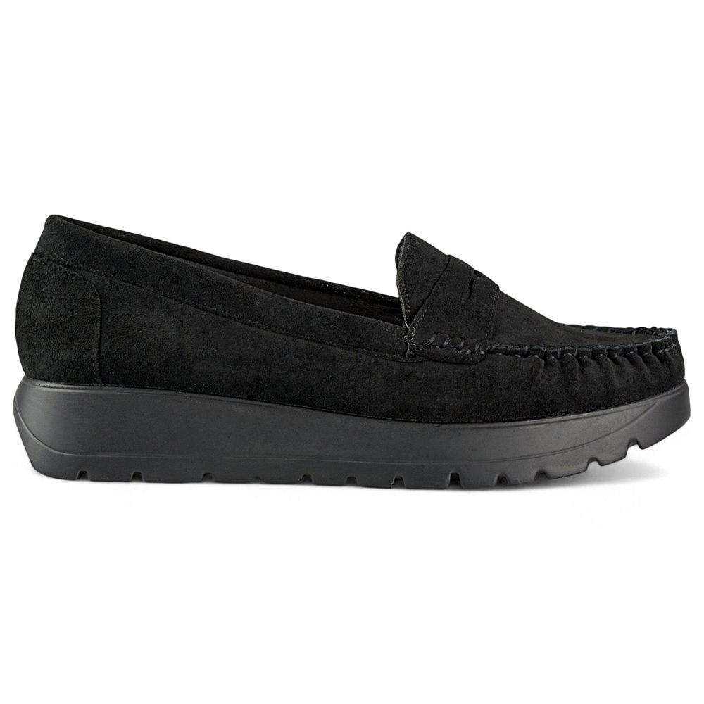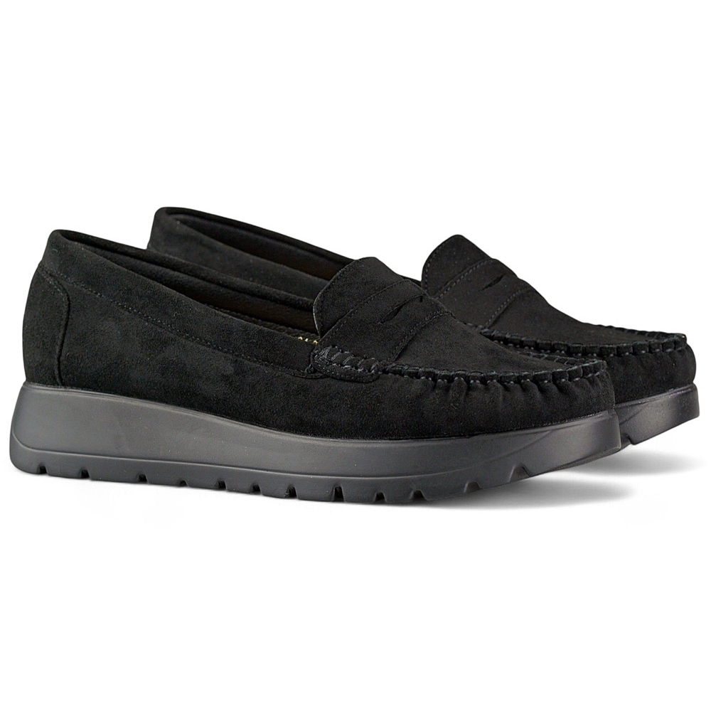 Részletek: Kényelmes fekete női mokaszin vastag talppal és bőr talpbetéttel
