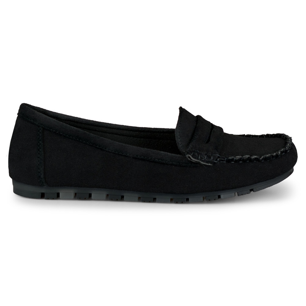 Kényelmes fekete női cipők - klasszikus egy modern kiadásban. A fekete ökológiai velúr a felső és a természetes bőr betéten elegáns megjelenést és kényelmet nyújt egész nap. A lapos, párnázott szintetikus talp és a csúszó kialakítás praktikus és könnyen használható a cipőt - tökéletes a tavaszra és a nyárra.