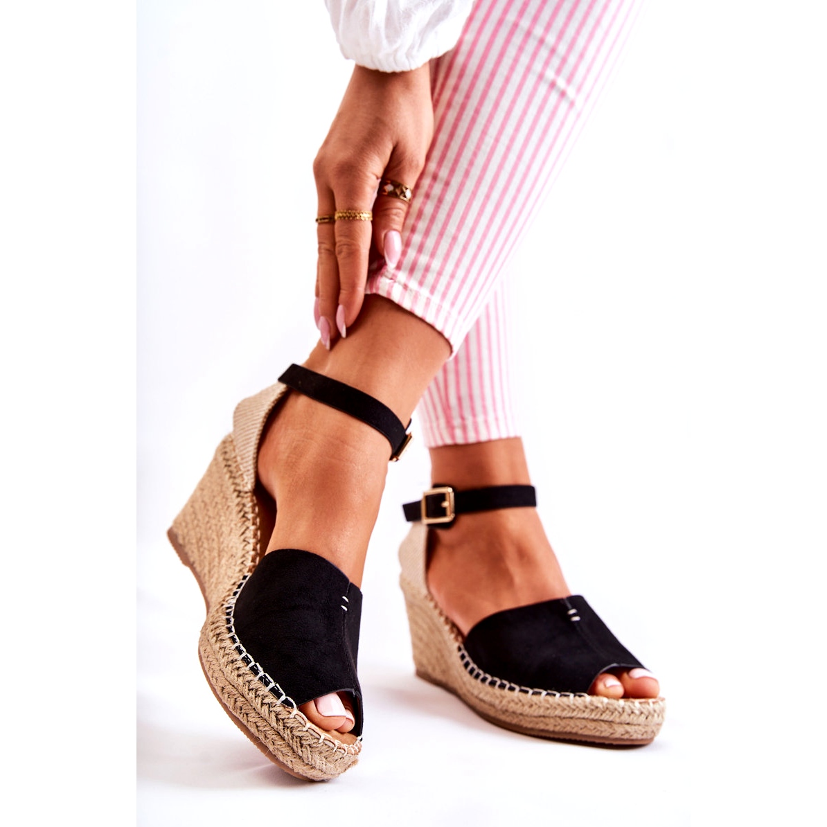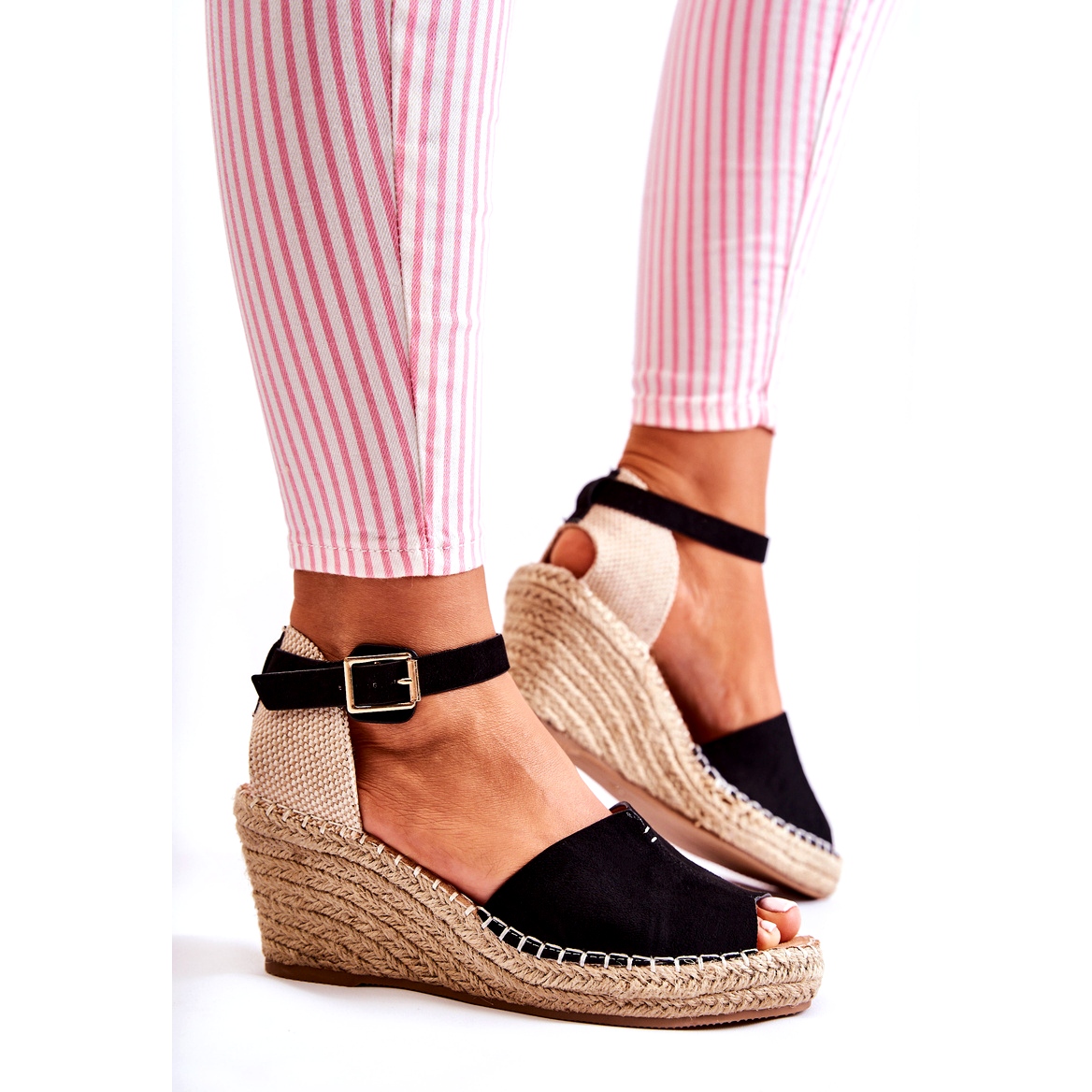 A 7,5 cm magasságú stabil ékre állítva nemcsak a lábak optikai meghosszabbítását biztosítják, hanem a nap folyamán viselkedés kényelmét is. A gumi műanyagból készült, nem szellőző talp garantálja a különféle felületek biztonságát, és a zsinór gazdagítja az időtlen kialakításukat.