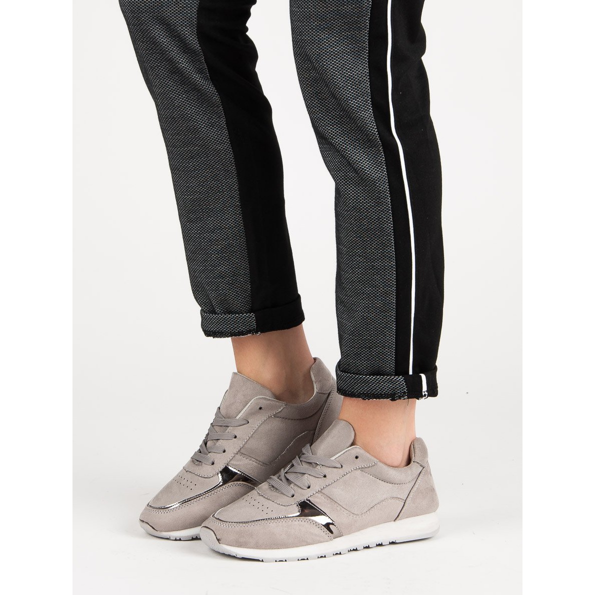 Fedezze fel a kényelmet és a stílust az elegáns szürke árnyalatú Jumex sportcipőkkel. Ezek az egyedi, ökológiai velúrbőrből készült női cipők tökéletesen ötvözik a sportosságot a klasszissal, ami ideális választássá teszi mind a mindennapi kirándulásokhoz, mind a formálisabb alkalmakhoz. A fényes alkalmazás egyedi varázst ad nekik, lehetővé téve, hogy különlegesnek érezzék magukat, és kitűnjenek a tömegből.