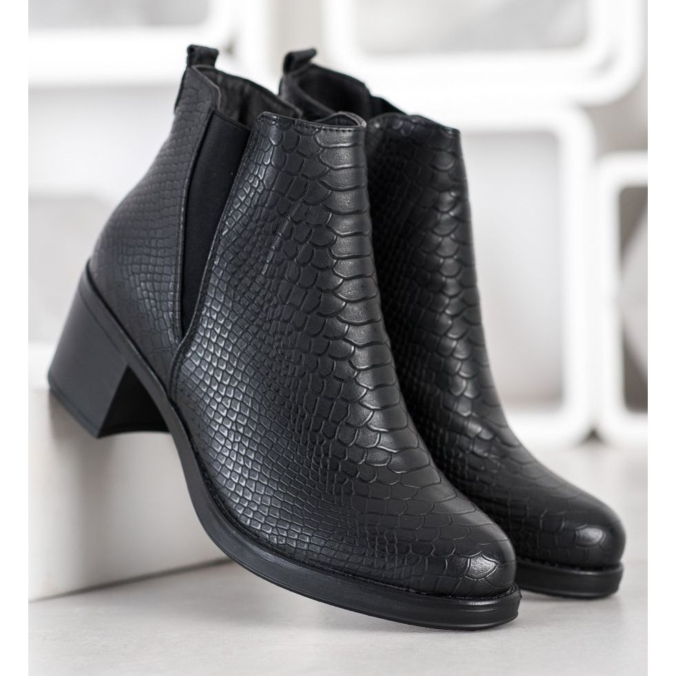 Fedezze fel a divatos és elegáns Sweet Shoes fekete bokacsizmát, amely tökéletesen kiegészíti őszi-téli ruhatárát. Ezt az egyedi női bokacsizmát kiváló minőségű ökológiai bőrből készült felsőrész jellemzi, amelyet krokodilbőrre emlékeztető dombornyomott minta díszít.