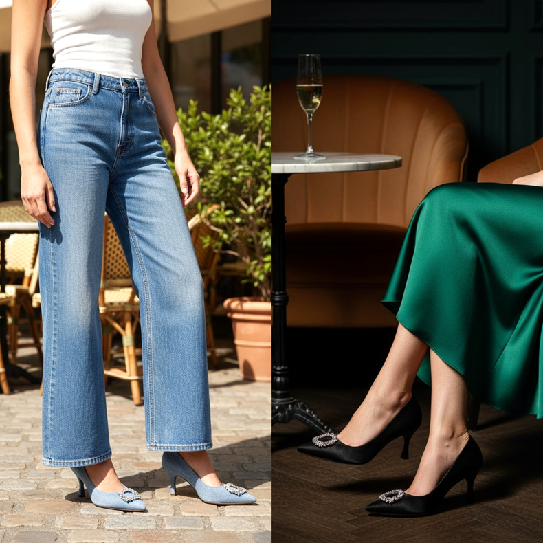 Egy vintage stílusú szatén midiruhával esténként a cicasarkú tökéletes választás. A finom sarokmagasság és a klasszikus szabás illeszkedik a 2026-ban uralkodó, régibb pénzhez és párizsi elegáns esztétikához.