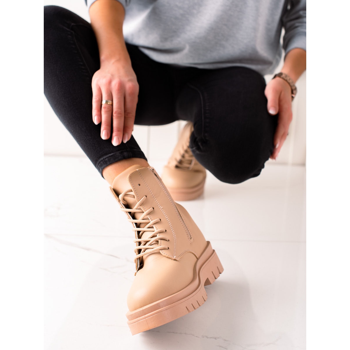 Fedezze fel az egyedi stílust és viselési kényelmet a bézs színű, klasszikus barna TRENDI csizmának köszönhetően. Ezek az elegáns cipők kiváló választás a modern nők számára, akik értékelik a divatos megjelenést és a funkcionalitást.