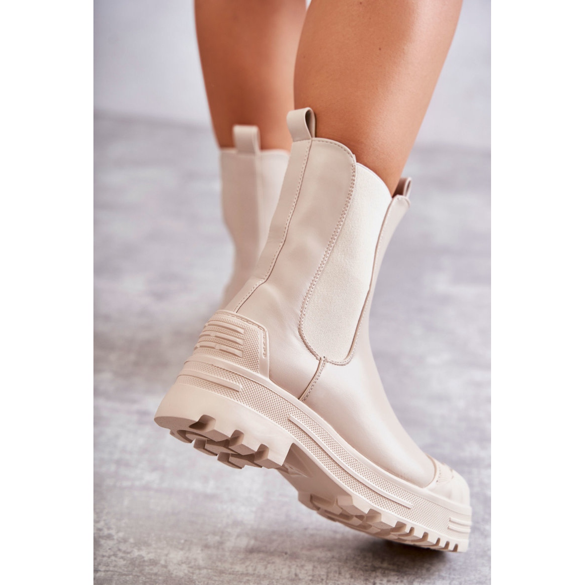 A csizmák 3 cm magas platformra és lapos sarkra vannak állítva, így tökéletes választás hosszú városi napokra. A szövetbetétnek köszönhetően a mindennapi viselet kényelmes, a felsőrész tetején lévő hurkok pedig megkönnyítik a cipő gyors felhúzását.