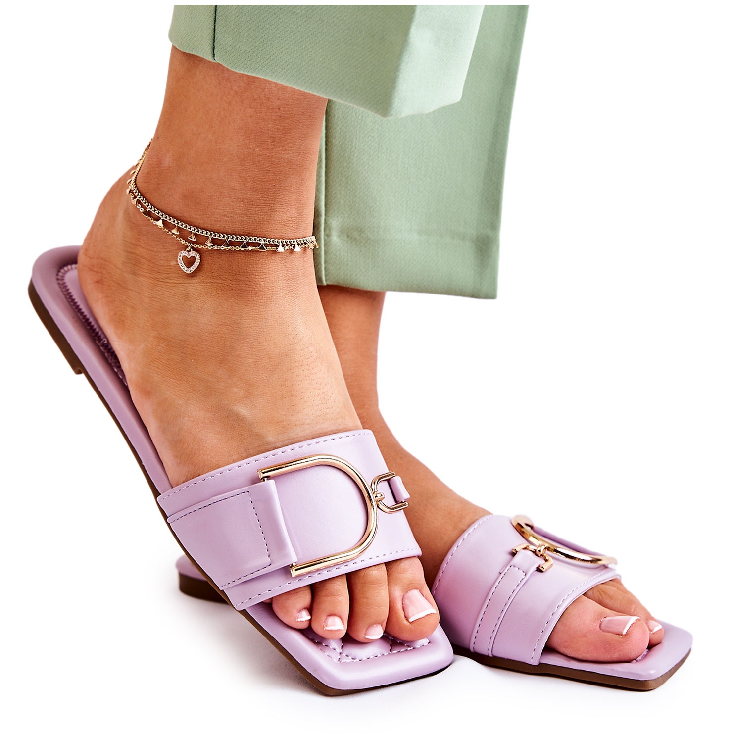 Klasszikus, elegáns női papucs divatos lila színű, kiváló minőségű ökológiai bőrből készült. Az első heveder egy hatékony láncot díszít, és a puha, steppelt öko-bőr betét egész nap kényelmet nyújt. A modellt egy lapos sarokba (1,5 cm) és egy nem -slip bézs talpra ágyazzák be - tökéletes a forró napokra.