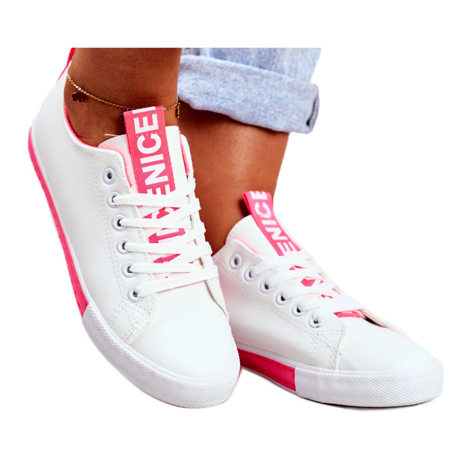 A tornacipőket egy egyedi részlet különbözteti meg - a sarkon és a nyelven található díszítés a "NICE" felirat formájában, amely karaktert és modernitást kölcsönöz nekik. Kiváló minőségű ökológiai bőrből készültek, nem csak esztétikusak, de környezetbarátak is.