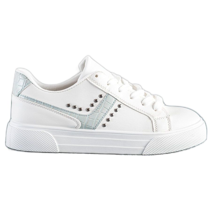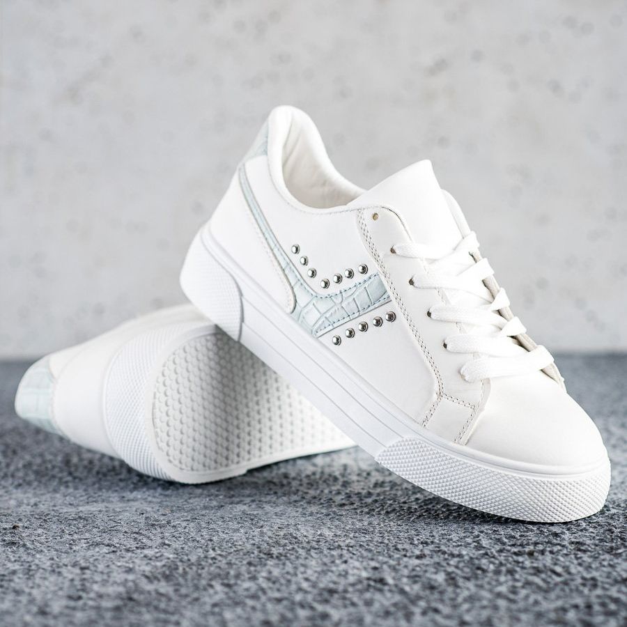Érdemes odafigyelni az eredeti részletre - a kék betétre és a strasszokra, amelyek karaktert adnak a cipőknek, és megkülönböztetik őket más modellektől. Minta nélkül, klasszikus fehér színben univerzális gardrób elem, amely könnyedén kombinálható különféle kiegészítőkkel.