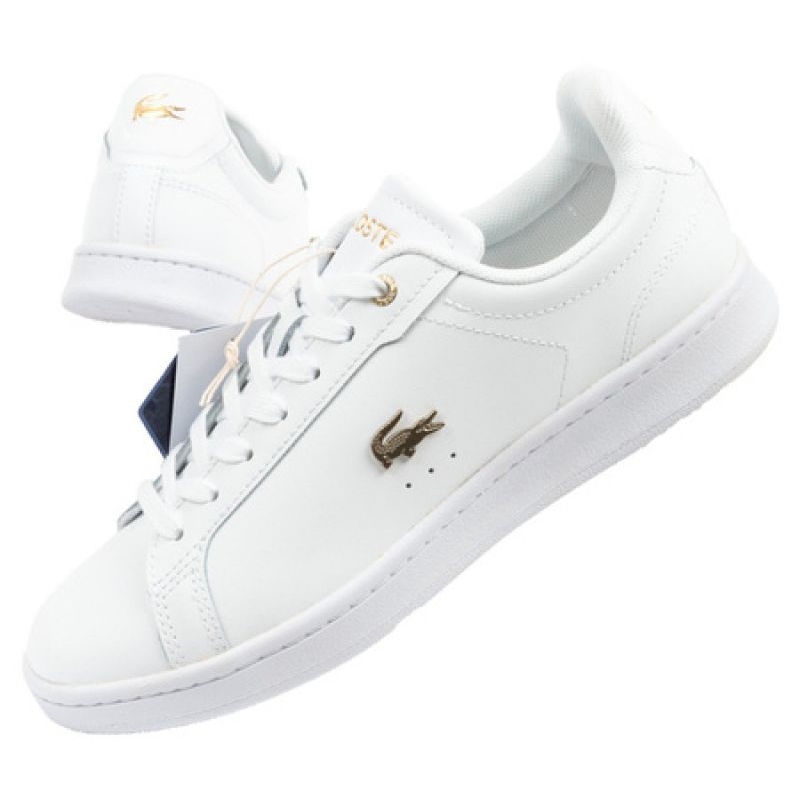 A Lacoste Carnaby Pro 40216 cipő elegáns női sport -lábbeli, amely ötvözi a klasszikusokat a modern stílusban. A legmagasabb minőségű természetes bőrből készültek, és ezeket nemcsak egyedi megjelenés, hanem nagy tartósság is jellemzi. Az arany lacoste logóval és egy fém krokodiltel díszített fehér felsőrészek elegáns akcentust adnak a cipőnek, amely bármilyen stilizálással tökéletesen megy.
