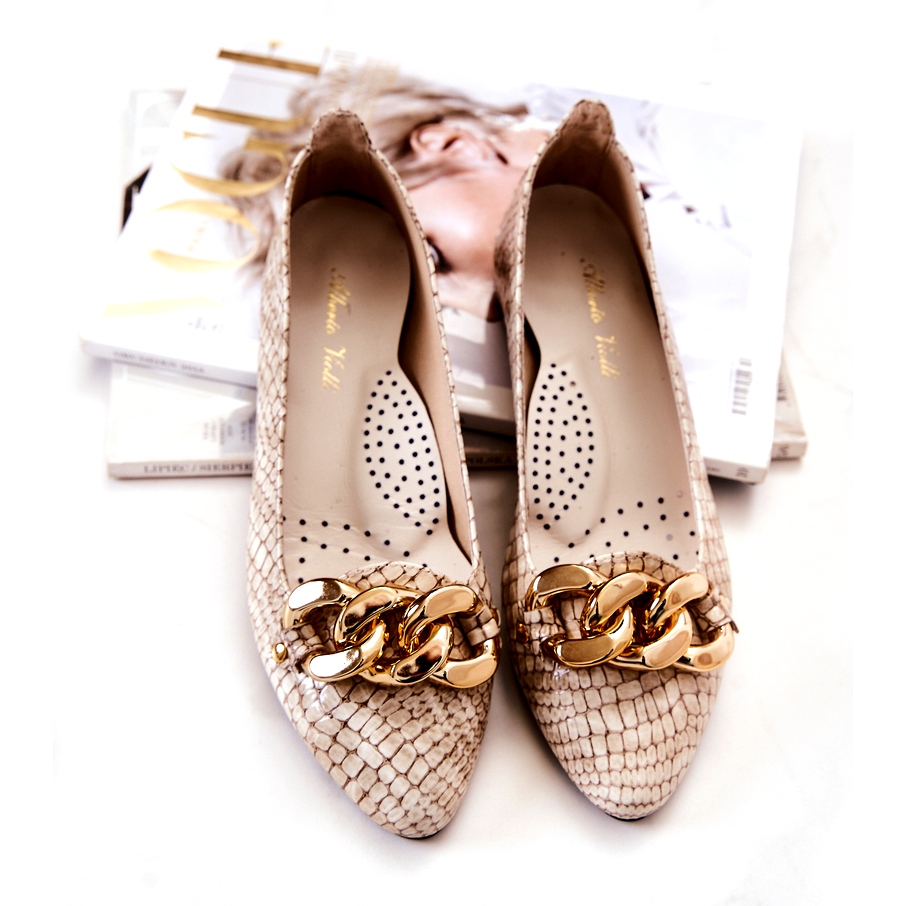 A cipő belseje puha bőrbetéttel van ellátva, amely ráadásul profilozott és perforált, ami megfelelő szellőzést biztosít és alkalmazkodik a láb formájához. A szivattyúk egyedi részlete az elegáns lánc, amely eleganciát ad és kiemeli eredetiségüket.