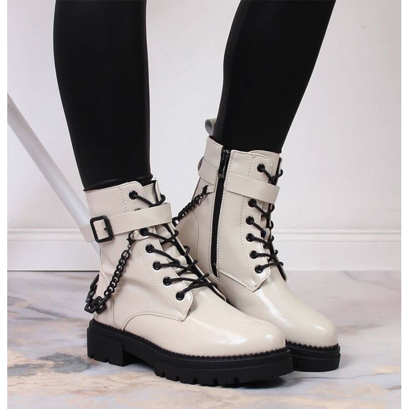 Elegáns női csizma a Laura La.fi Premium vonalból, kombinálva az elegáns megjelenést a vigasztalással. A lakkozott ökológiai bőr bézs és dekoratív lánc meleg árnyékában divatos, univerzális karaktert ad nekik, ideális a mindennapi és formálisabb stilizációkhoz.