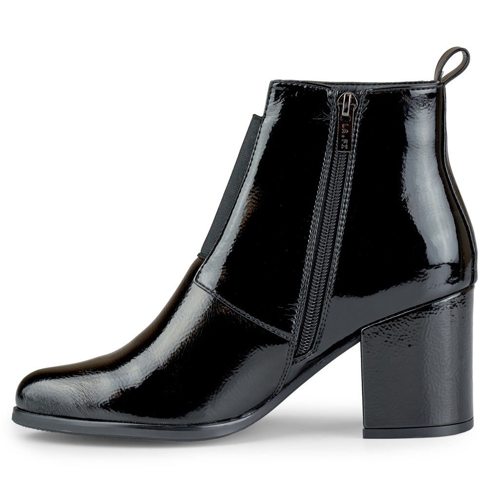 Stílusos és elegáns fekete női bokacsizmát kínálunk lakk felülettel, amely egyszerre garantálja a kényelmet és a divatos megjelenést az őszi és téli szezonban. Ez a rugalmas bokacsizma a mindennapi klasszikusok kvintesszenciája divatos csavarral, amely tökéletes kiegészítője lesz bármilyen városi stílusnak. A lábbeli egyedi karakterét a fényes, ökológiai velúr felsőrész hangsúlyozza, mely gyönyörűen kontraszt az őszi-téli időjárással.