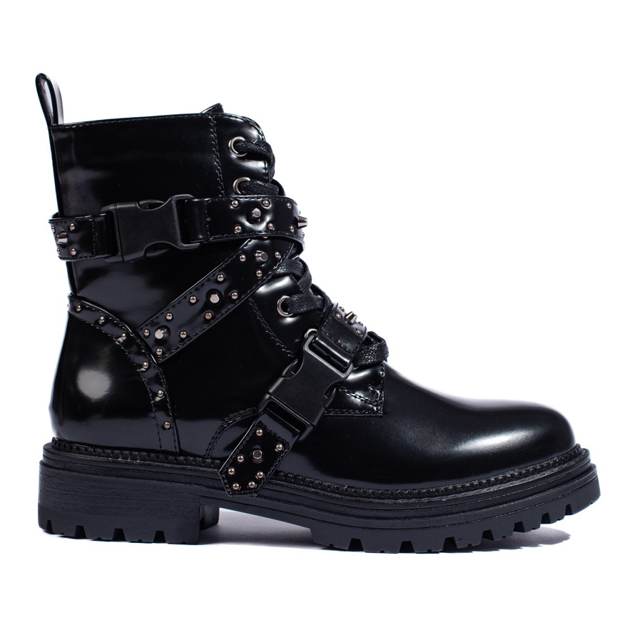 A SHELOVET Ladies lakkfekete munkáscsizma tökéletes választás a stílust és a kényelmet egyaránt értékelő nők számára. A kiváló minőségű lakkbőrből készült bokacsizma elegáns, fényes felülettel és divatos részletekkel, például strasszokkal és szegecsekkel rendelkezik.