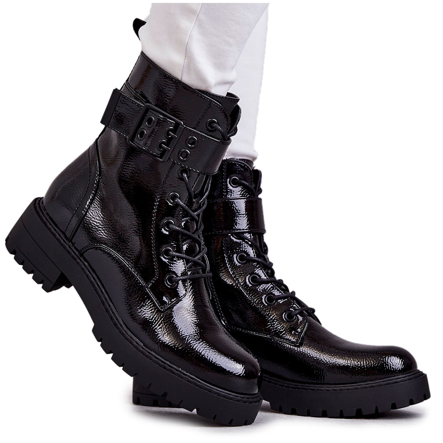 Részletek: PJ1 Lakkozott fűzős női csizma lapos sarkú fekete Firmina