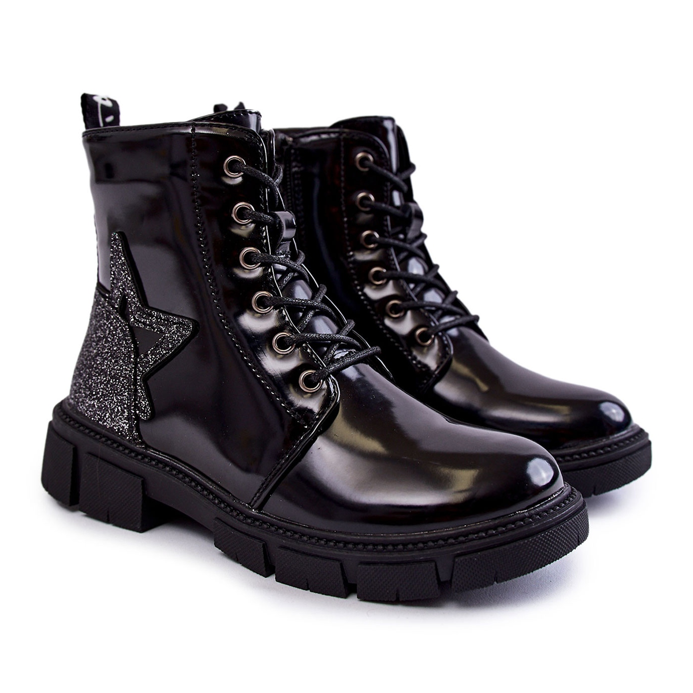 A fekete bokacsizma modellt klasszikus fűzés és praktikus cipzár jellemzi a felsőrész oldalán, amely megkönnyíti a fel- és levételt. Az oldalán található további csillogó díszítés varázslatot kölcsönöz, és minden lány különlegesnek érzi magát bennük.