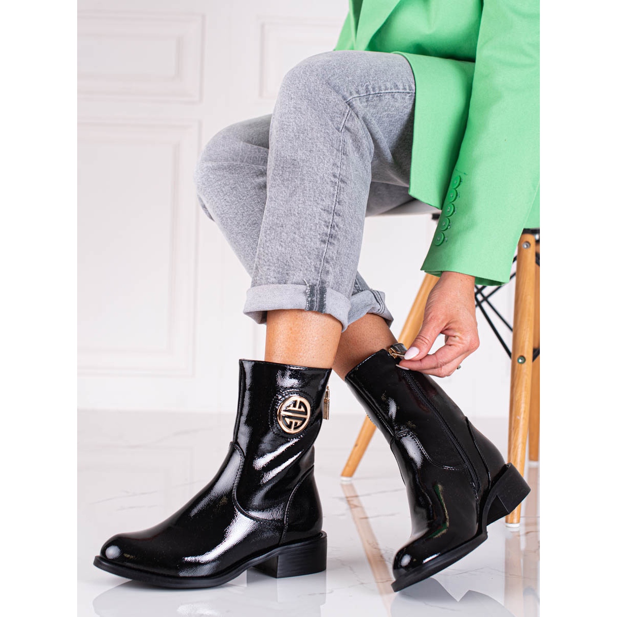 A Shelovet fekete lakk magas női bokacsizma tökéletes választás az őszi/téli szezonra azoknak a nőknek, akik értékelik az eleganciát és a kényelmet. Az ökológiai velúrból készült bokacsizma a divatos dizájnt praktikus megoldásokkal ötvözi.