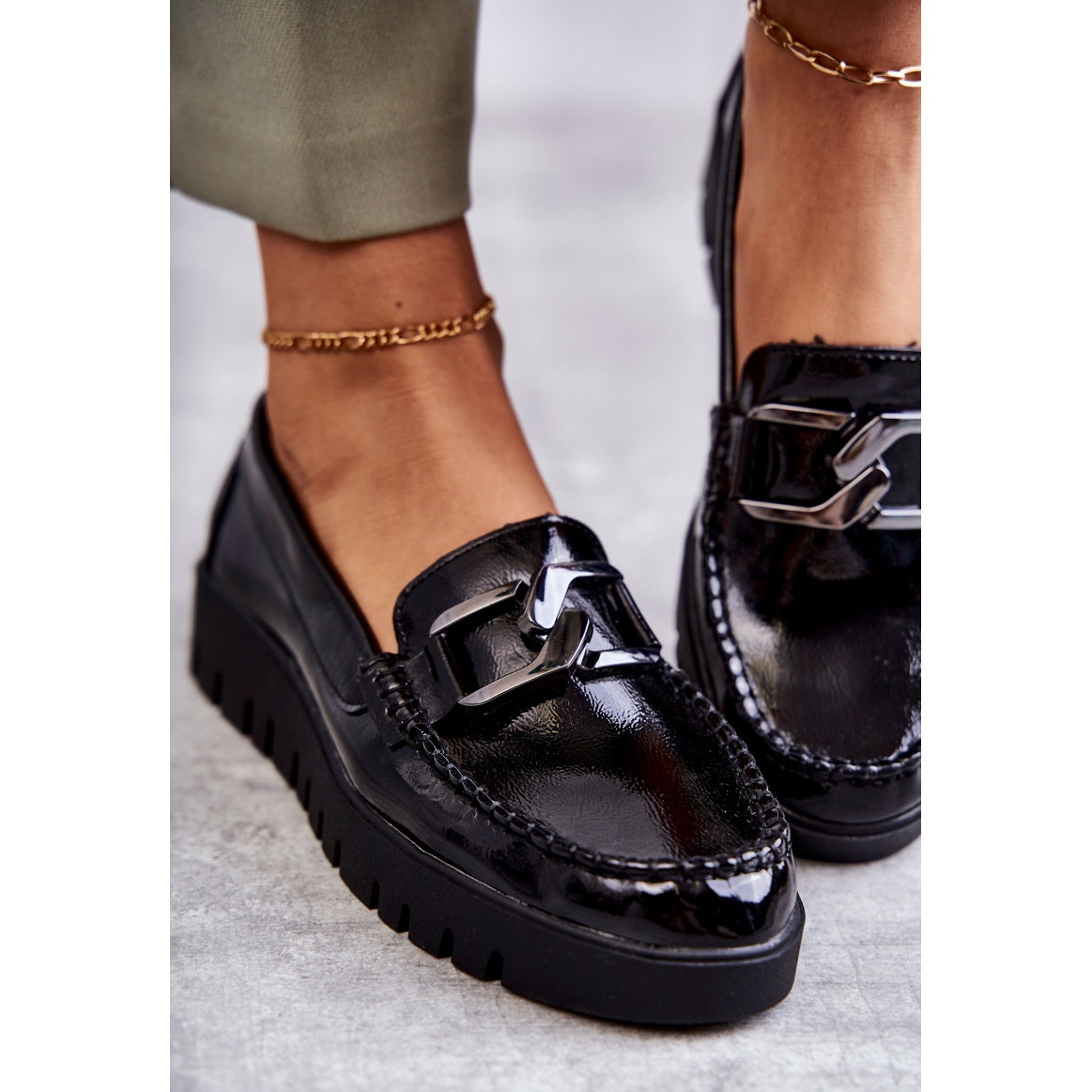 A jellegzetes műanyag díszítés eleganciát ad, a masszív, jól barázdált talp pedig stabilitást és kényelmet garantál egész nap. Eco lakkbőrből készült cipők az esztétikát a praktikummal ötvözik, így tökéletes választás a mindennapi használatra.