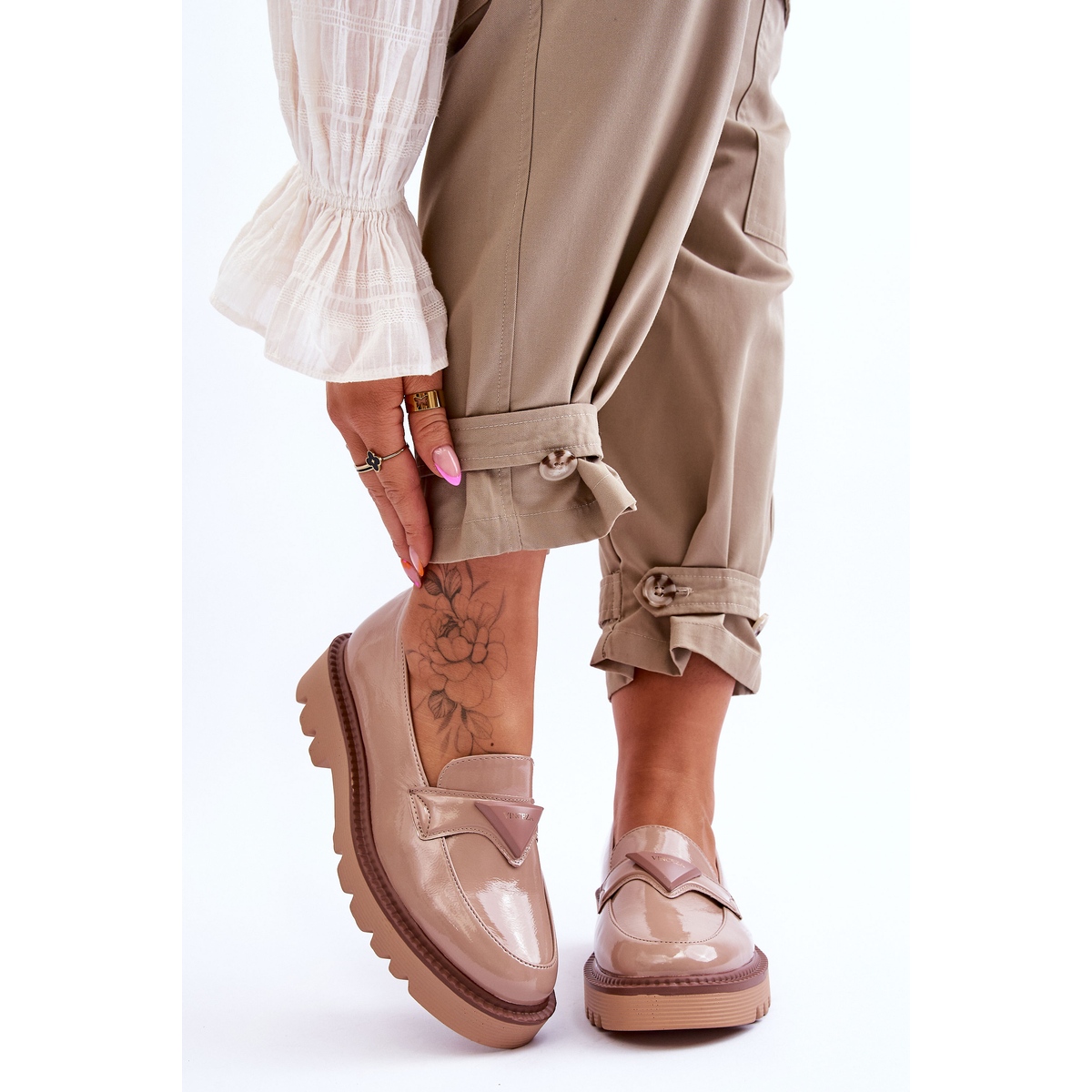 Fedezze fel az eleganciát és a kényelmet bármikor a Vinceza Jonett bézs színű platformcipőivel. Ezek a kiváló minőségű eco bőrből készült klasszikus női cipők a modern dizájnt ötvözik a funkcionalitással. A mokaszinok elején egy finom csík található háromszög alakú emblémával, amely egyedi karaktert ad nekik.