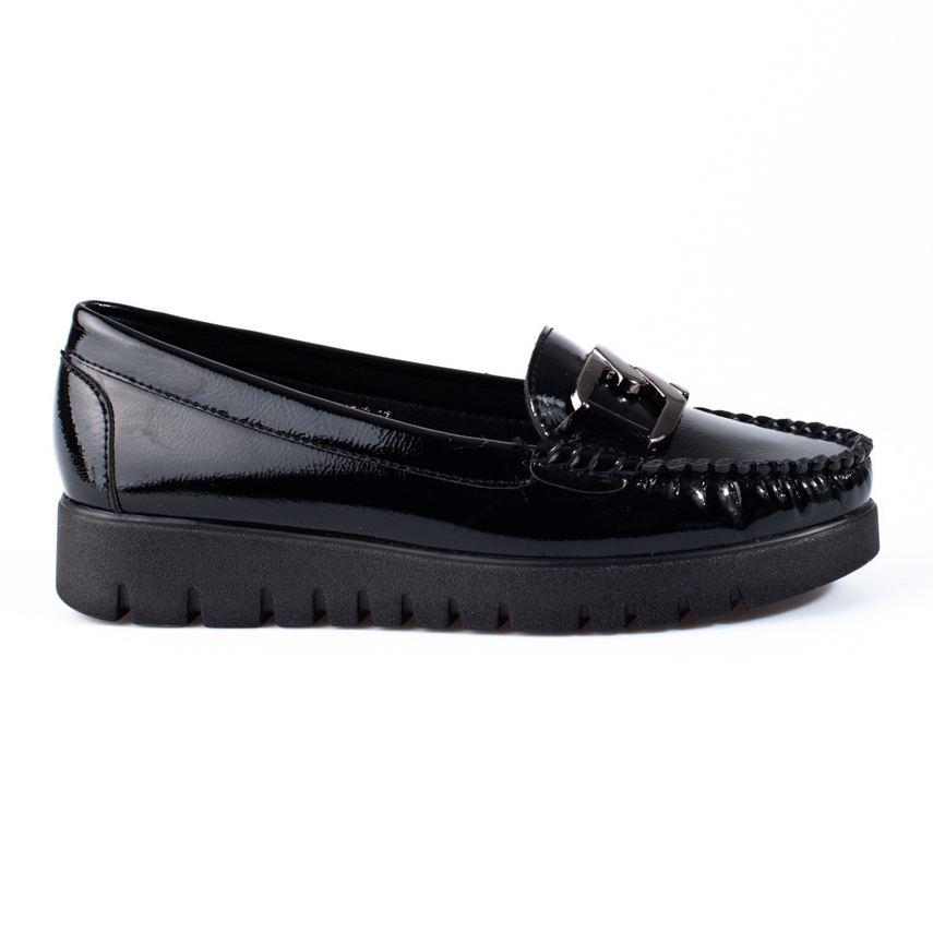 A Potocki női mokaszinok tökéletes választás azoknak a nőknek, akik értékelik az eleganciát és a kényelmet a mindennapi használat során. A klasszikus fekete színű lakkbőrből készült naplopók tökéletesen illeszkednek az alkalmi és formálisabb stílusokhoz. A beépített saroknak és a felcsúsztatható rögzítési rendszernek köszönhetően a felhelyezésük gyors és kényelmes.