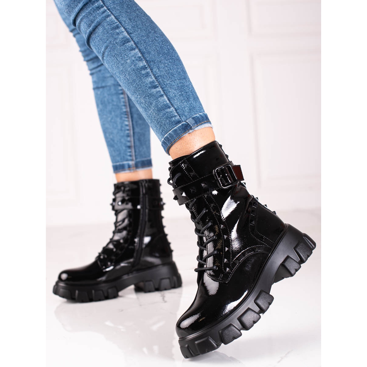 A Shelovet női lakkozott munkástáska kiváló választás azoknak a nőknek, akik nem csak a stílust, hanem a kényelmet is értékelik. Ez a fekete bokacsizma a lezser és rock karaktert ötvözi, így tökéletes a mindennapi kirándulásokhoz az őszi/téli szezonban.