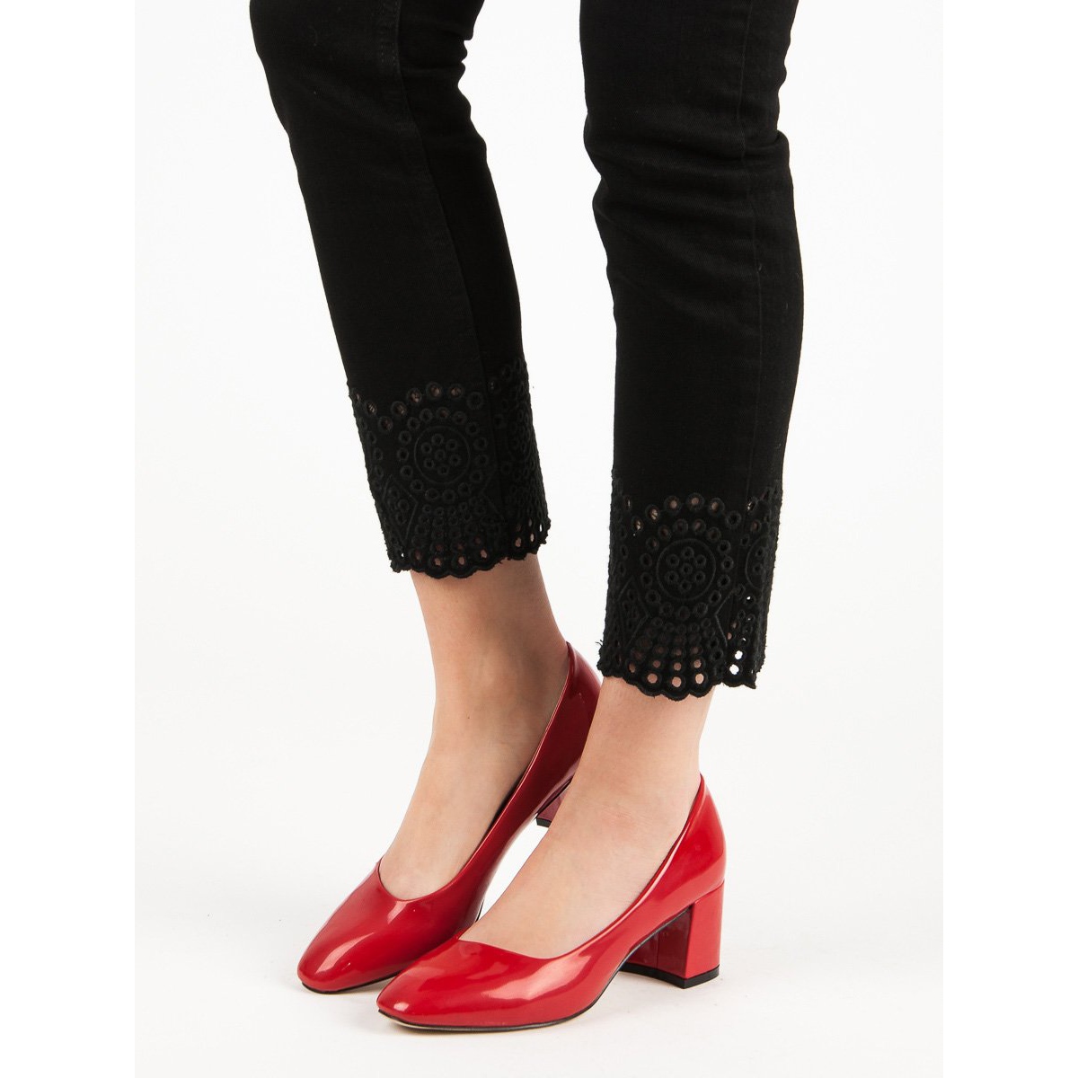 A kiváló minőségű ökológiai bőrből készült pumpák lakkozott felületükkel tűnnek ki, ami vonzza a tekintetet és egyedi fényt ad minden stílusnak. A kerek orr és a beépített, merevített sarok kényelmet és stabilitást biztosít, így kiváló választás hosszú órákon át.