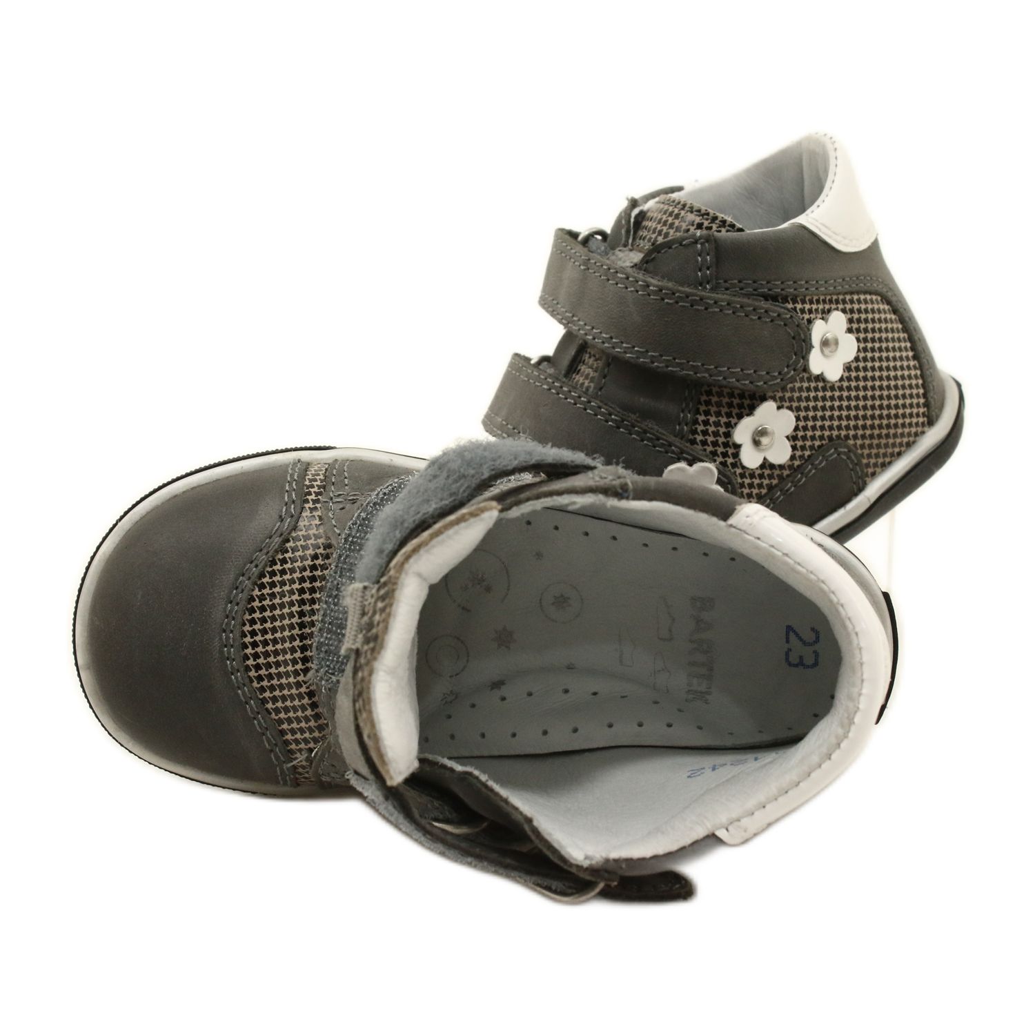 Elegáns és kényelmes cipő a lengyel Bartek márkától, 91904-1FN modell, univerzális szürke színben, finom fehér virágokkal. A gyermekek lábfejének megfelelő fejlődését szem előtt tartva tervezték – természetes anyagok, átgondolt felépítés és esztétikus kialakítás kombinációja.