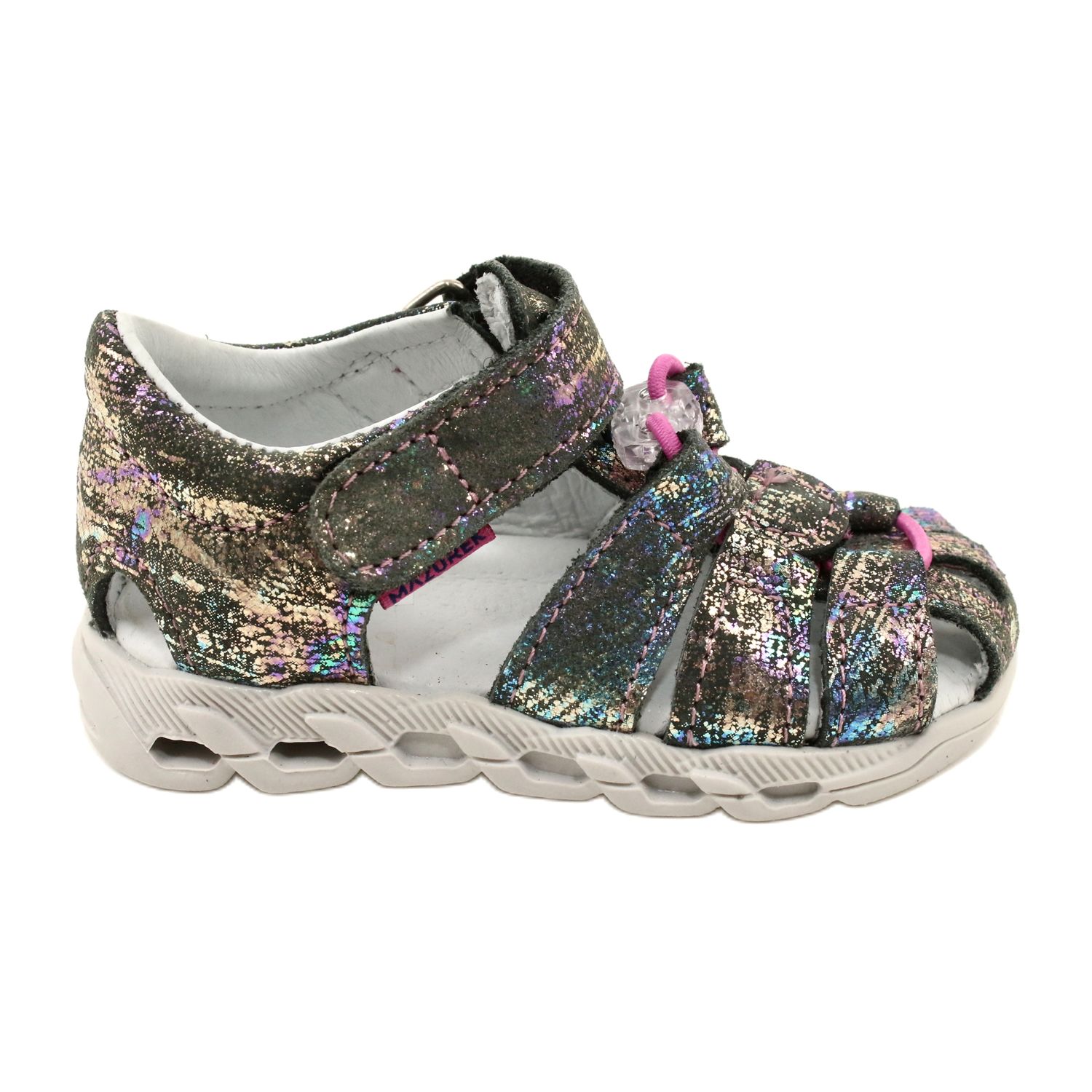 A Mazurek 1364 fémszürke fényes bőr szandál tökéletes választás kislányoknak. A szülők és a nagyszülők tudják, milyen fontos, hogy a gyermekcipők ne csak esztétikai, hanem egészségügyi funkciót is betöltsenek. A Mazurek szandál e két szempont tökéletes kombinációja.