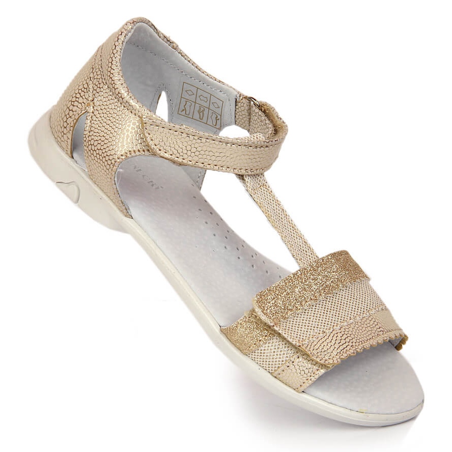 Gyönyörű arany színű lányok tépőzáras szandálokat kínálunk a neves Kornecki márkától - a 6705-ös modelltől. Ez a nyári szandál, amely tökéletes a meleg napokra, tökéletes kiegészítője lesz bármilyen stílusnak. Kiváló minőségű ökológiai külső bőrből készültek, így biztosítják a kényelmet és a tartósságot, a természetes bőr betét és bélés pedig a viselési kényelmet garantálja.