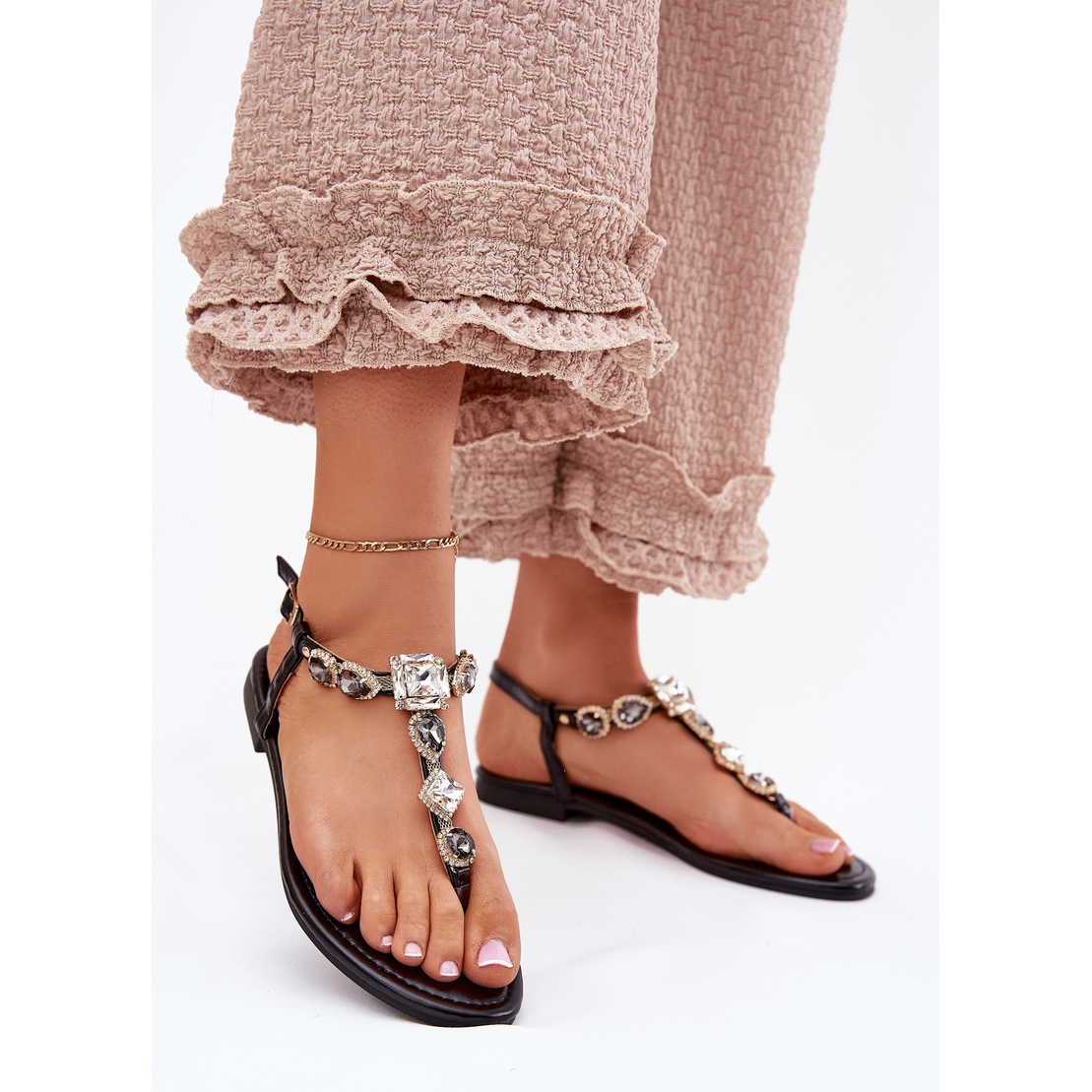 Fedezze fel az egyedi, lapos, káprázatos női szandált kristályokkal, elegáns fekete színű. Ezek a stílusos szandál, amely öko bőrből készült, kiváló választás a meleg nyári napokhoz. Az 1,5 cm magasságú lapos saroknak köszönhetően a nap folyamán a maximális kényelmet élvezheti, függetlenül az alkalmatól.