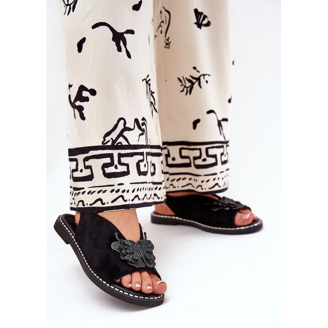 Részletek: Jezzi Lapos, feküdt női szandál fekete dekorációval